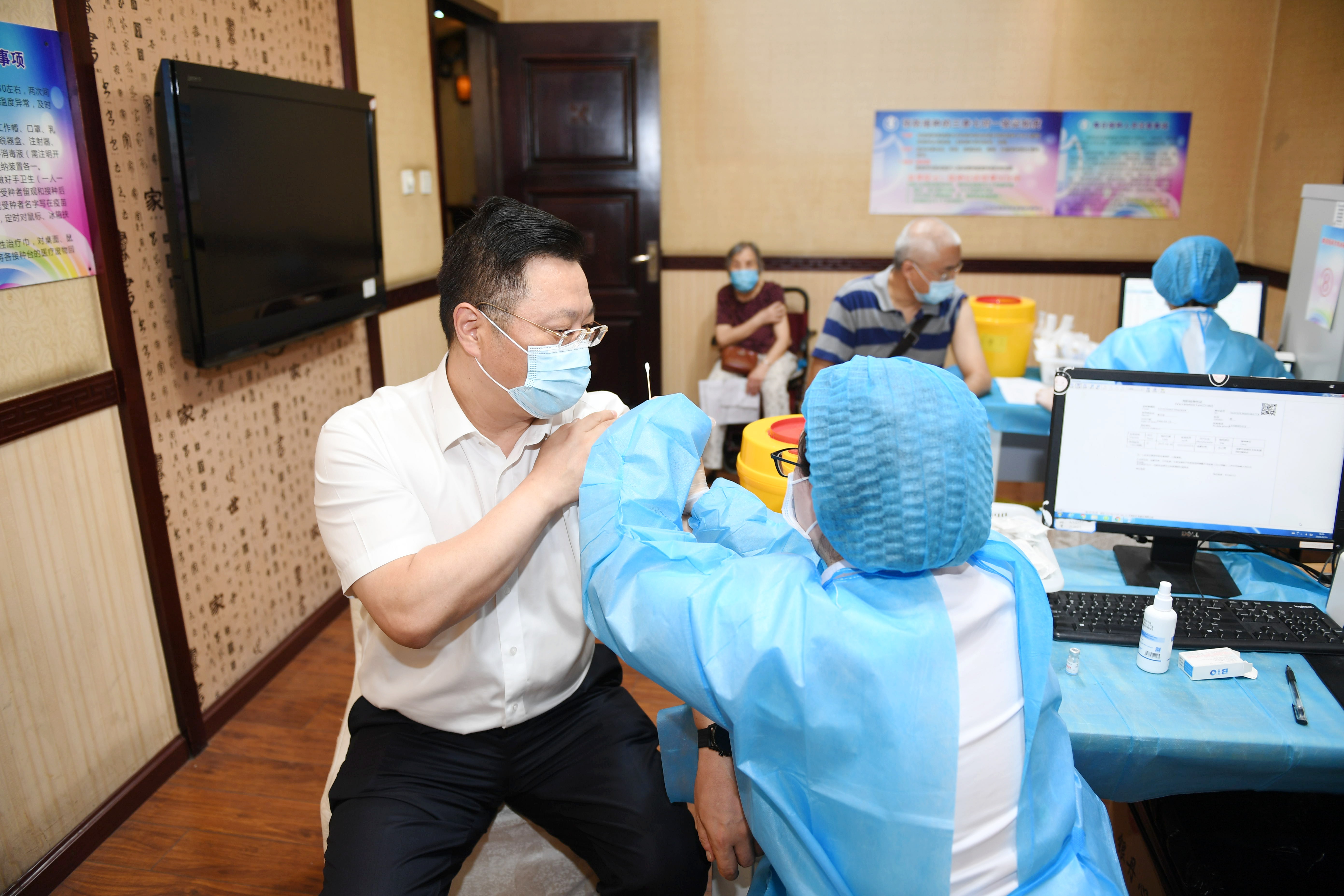 在接種現場,前來接種的干部職工佩戴口罩有序排隊,主動接受現場醫(yī)護人員的體溫檢測和健康問詢,在填寫相關表格登記后有序進行疫苗注射。