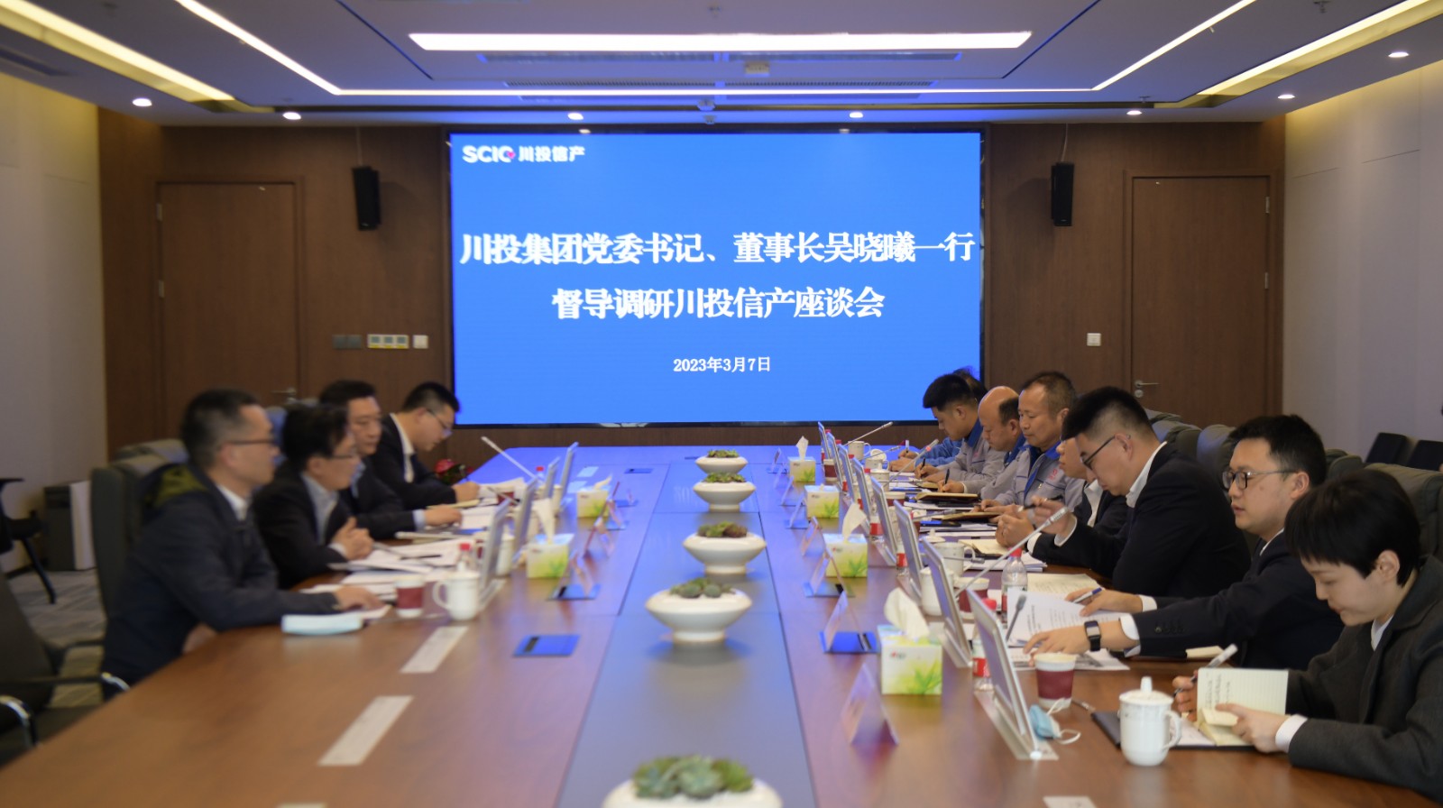 3月7日,集團公司黨委書記、董事長吳曉曦率隊赴川投信產調研。集團公司財務總監(jiān)黃勁,總經理助理李勝章陪同調研。