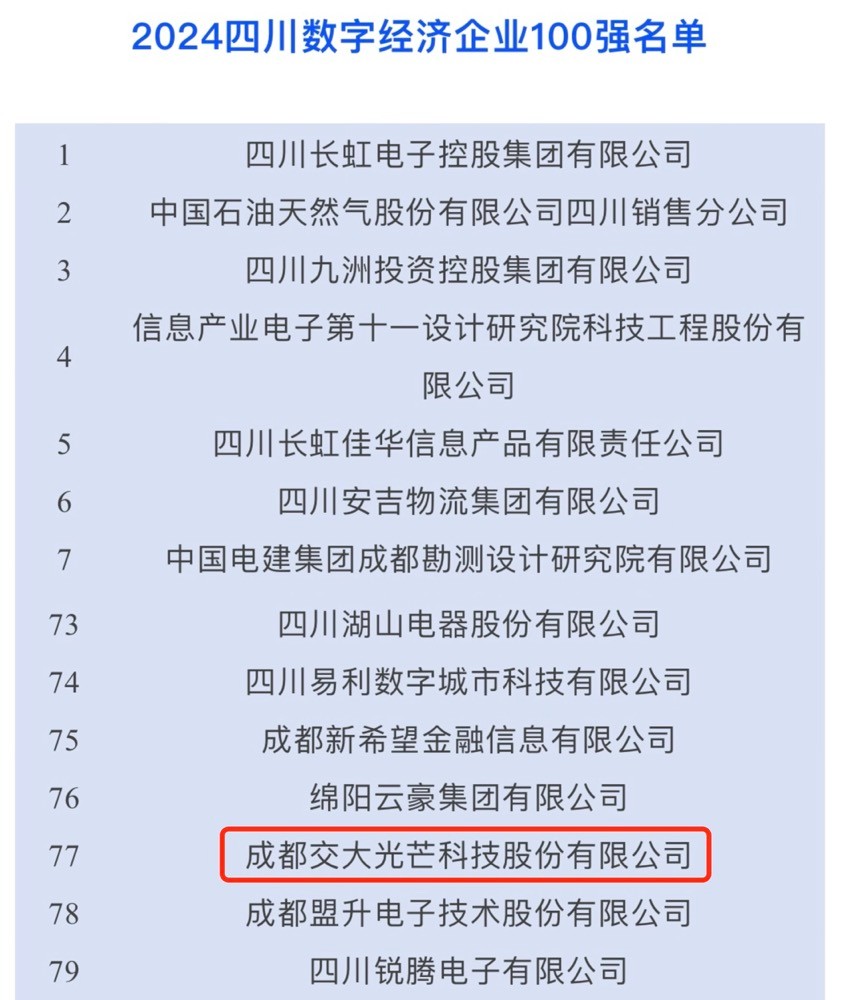 9月26日,由四川省企業(yè)聯(lián)合會、四川省企業(yè)家協(xié)會主辦的2024四川大企業(yè)大集團發(fā)展大會在成都召開。會上,發(fā)布了2024年四川省綜合、制造業(yè)、服務業(yè)百強、數(shù)字經(jīng)濟100強企業(yè)榜單。交大光芒榮登四川數(shù)字經(jīng)濟企業(yè)100強榜單,位列第77位。