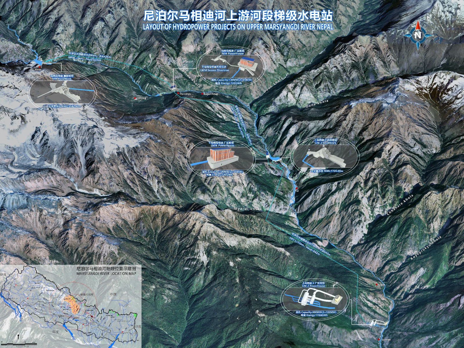 馬相迪梯級水電站項目位于尼泊爾甘達基省馬相迪河流域,由三座首尾相連的水電站組成,自上而下分別是馬楠馬相迪水電站、下馬楠馬相迪水電站和上馬相迪-2水電站,總裝機約60萬千瓦,總投資約12億美元。此次正式開工的馬楠馬相迪水電站作為第一級開發(fā)的水電站,總投資3.23億美元,裝機容量為13.5萬千瓦,年均發(fā)電量7.12億千瓦時。