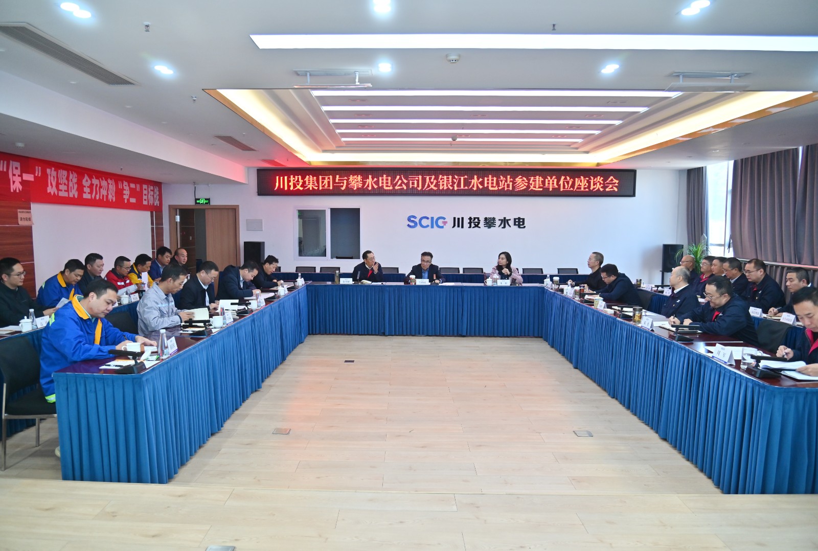 隨后,吳曉曦一行座談聽取了項目工程建設(shè)、投產(chǎn)計劃、科研創(chuàng)新等情況匯報,充分肯定了工程項目的階段性成績,并向參建各方的辛勤付出表示感謝。他強(qiáng)調(diào),作為省級重點項目,銀江水電站承載著攀枝花市民的美好期待,高質(zhì)量建成投產(chǎn)達(dá)效意義重大。參建各方要千方百計保進(jìn)度,密切配合、攻堅克難,確保年底首臺機(jī)組發(fā)電;要千方百計保質(zhì)量,堅持高標(biāo)準(zhǔn)、嚴(yán)要求,確保施工規(guī)范、質(zhì)量過硬,努力打造標(biāo)桿工程;要千方百計保安全,壓緊壓實安全生產(chǎn)責(zé)任,落實落細(xì)安全防護(hù)措施,堅決遏制事故發(fā)生。要認(rèn)真履行國企責(zé)任,杜絕拖欠和克扣農(nóng)民工工資,確保安全穩(wěn)定和諧。會上,朱莉?qū)Π踩?、環(huán)保、維穩(wěn)等工作作出具體安排。