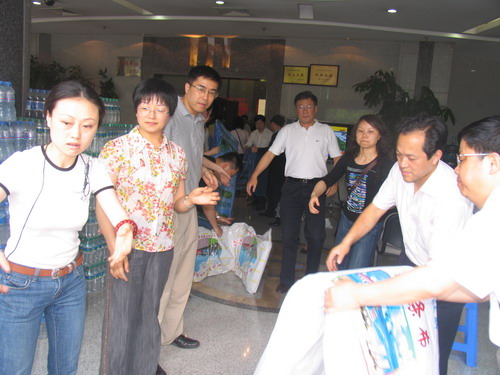 2008年5月15日14點(diǎn)至16日12點(diǎn),中建八局、中建三局、四川瑞云、重慶園林、浙江精工、上海和興、北京綠菌、深圳黎源等眾多施工單位均踴躍向?yàn)?zāi)區(qū)獻(xiàn)愛心,捐贈(zèng)抗震救災(zāi)物資,共計(jì)收到災(zāi)區(qū)急需物資有礦泉水528件、帳篷43頂、雨靴30雙、火腿腸4箱、榨菜10箱、餅干73箱、面包2箱、方便面125件、彩條布97件、軍用被10床、雨衣140件、手套8箱(4800雙)、尼龍繩10公斤。