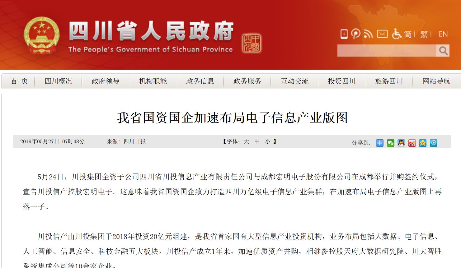 5月24日,川投集團(tuán)全資子公司四川省川投信息產(chǎn)業(yè)有限責(zé)任公司與成都宏明電子股份有限公司在成都舉行并購簽約儀式,宣告川投信產(chǎn)控股宏明電子。這意味著我省國資國企致力打造四川萬億級電子信息產(chǎn)業(yè)集群,在加速布局電子信息產(chǎn)業(yè)版圖上再落一子。