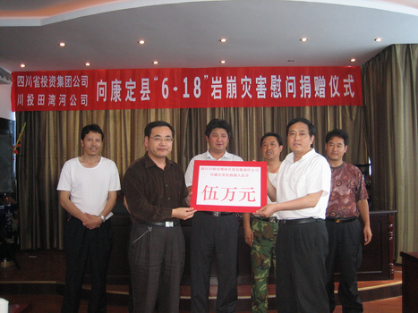 6月18日,仁宗海工程所在地康定縣發(fā)生巖崩自然災(zāi)害,造成11人死亡,6人受傷,房屋、道路、牲畜等財(cái)物損失達(dá)2000多萬(wàn)元。聞此消息后,經(jīng)口頭向集團(tuán)公司領(lǐng)導(dǎo)請(qǐng)示同意,公司總經(jīng)理孫志祥于6月20日前往康定縣時(shí)濟(jì)鄉(xiāng)災(zāi)區(qū)向康定縣救災(zāi)工作組并通過(guò)他們向?yàn)?zāi)區(qū)人民轉(zhuǎn)達(dá)了川投領(lǐng)導(dǎo)、田灣河公司和全體川投員工的慰問(wèn),并捐助伍萬(wàn)元慰問(wèn)金。