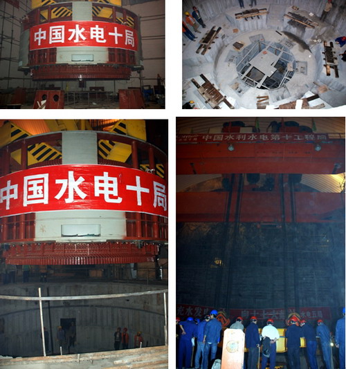 左下圖:定子吊入機(jī)坑。