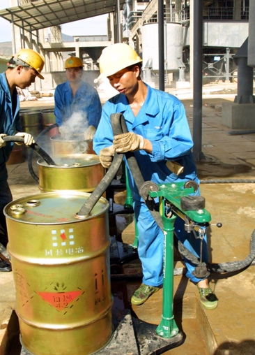圖四:災(zāi)情發(fā)生后,川投化工號召全體職工“立足本職,加倍努力,以實(shí)際行動支援災(zāi)區(qū)”(圖為生產(chǎn)一線職工灌裝成品黃磷時(shí)情景)。