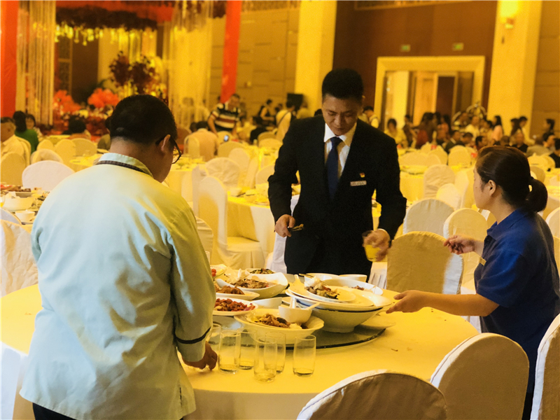 上午11點(diǎn),12名支援服務(wù)隊(duì)員在川投國(guó)際酒店蜀韻廳集合,進(jìn)行支援工作前的培訓(xùn)并安排分工。午宴開(kāi)始后,支援服務(wù)隊(duì)員按照各自的分工,與餐娛部同事共同完成了傳菜、上菜、看臺(tái)、收餐等工作,圓滿完成當(dāng)天所有接待任務(wù)。